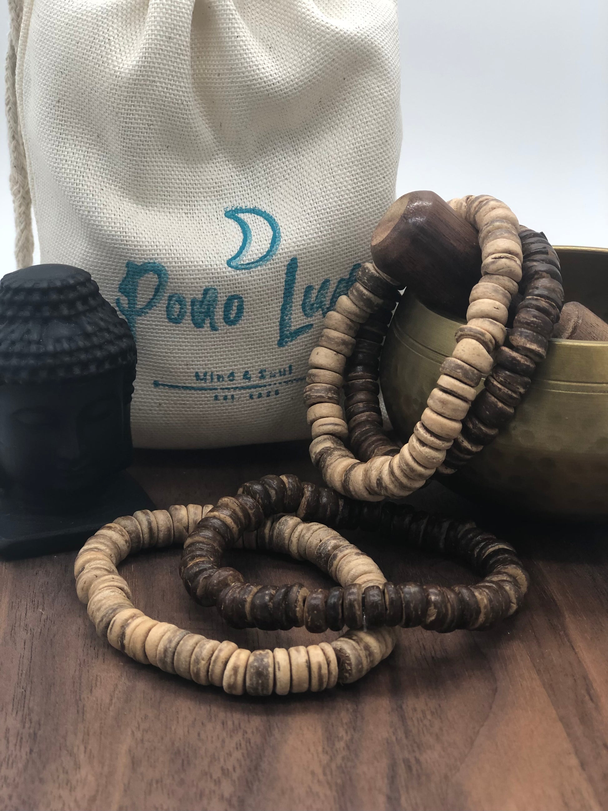 These two bracelets are upcycled with drift wood and coconut shell beads. Each fit wrist sizes 7.5-9. Beads are appx 3/4 inch thick and on strong stretch cord.