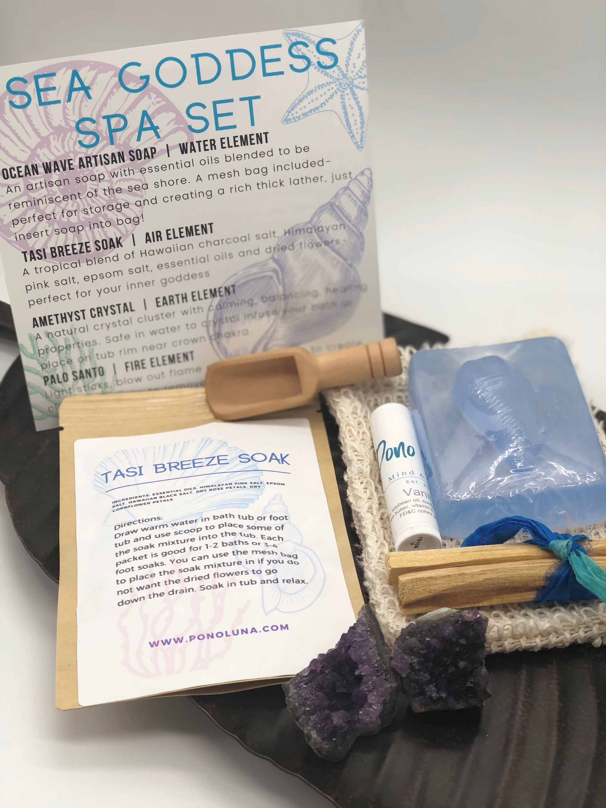 Our Sea Goddess Spa Set is the perfect gift for the mermaid in your life-yourself or someone special. This beautiful set comes with our tropical scented Tasi Breeze soak, Ocean Wave artisan soap, Amethyst mini cluster, and Palo Santo sticks. This set celebrates the four elements earth, air, fire and water.